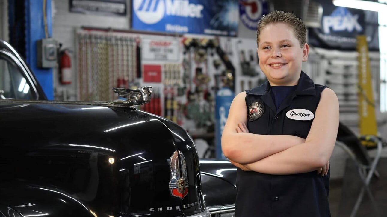 Growing up in his family's auto body shop, Giuseppe's knack for engines began as soon as he was big enough to pick up a wrench. These days he's donning a slicked-back greaser look and custom mechanic's shirt to share trade secrets with a savvy well beyond his years. 🧰