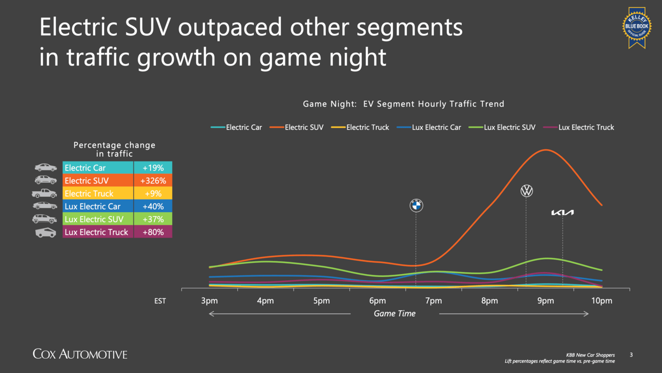 Intrigue Increase – EV traffic on Kelley Blue Book surged by 223% on game night, outpacing hybrids and highlighting a growing consumer shift towards electric SUVs.