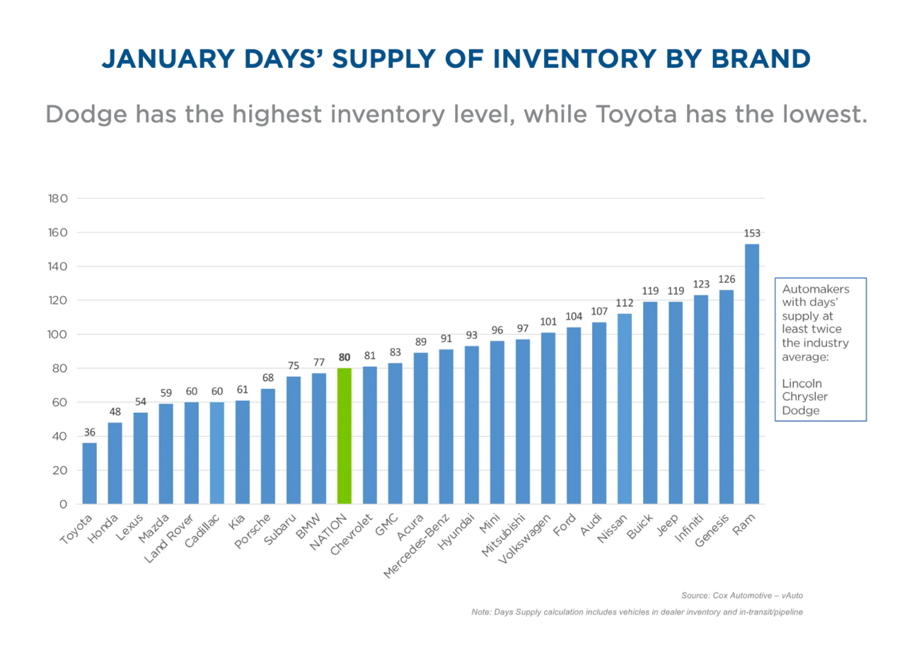 USA's Overflow – Dodge takes the trophy for the most stocked brand, with its compatriots Chrysler, Lincoln, and Ram not far behind.