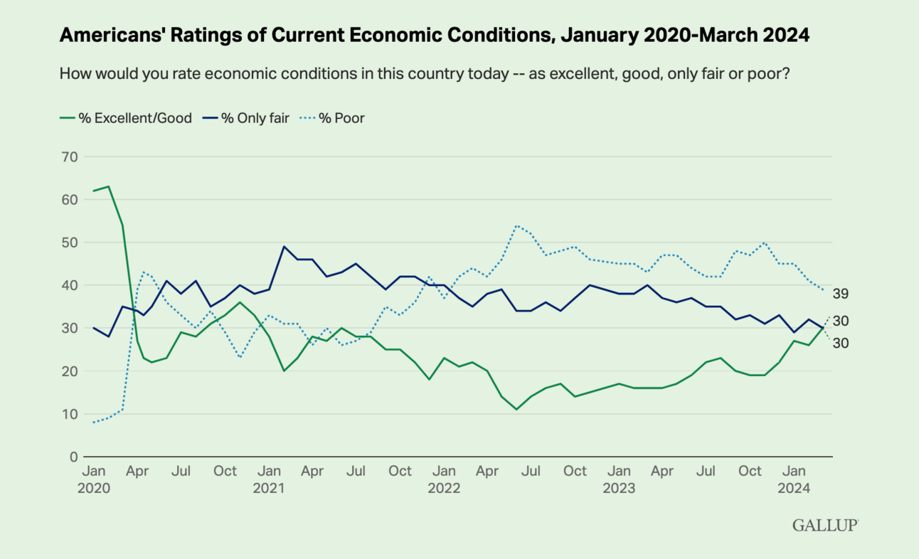 The current economic outlook has brightened a bit, with 30% of U.S. adults viewing conditions as excellent or good, nudging the index up to a -9 score.