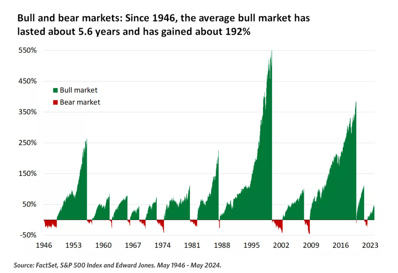 Analysts foresee the bull market that started in October 2022 potentially stretching into the years ahead, driven by improving inflation trends, a possible Fed rate-cutting cycle, and robust earnings growth.
