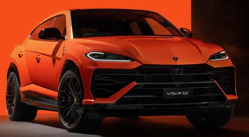 The Lamborghini Urus SE, a plug-in hybrid, retains its 4.0-liter twin-turbo V-8 while integrating an 189-hp electric motor, boosting the total power to 789 horsepower and 701 lb-ft torque. It accelerates to 62 mph in 3.4 seconds and has a 194 mph top speed. This model features a 25.7-kWh battery providing over 37 miles of electric range.