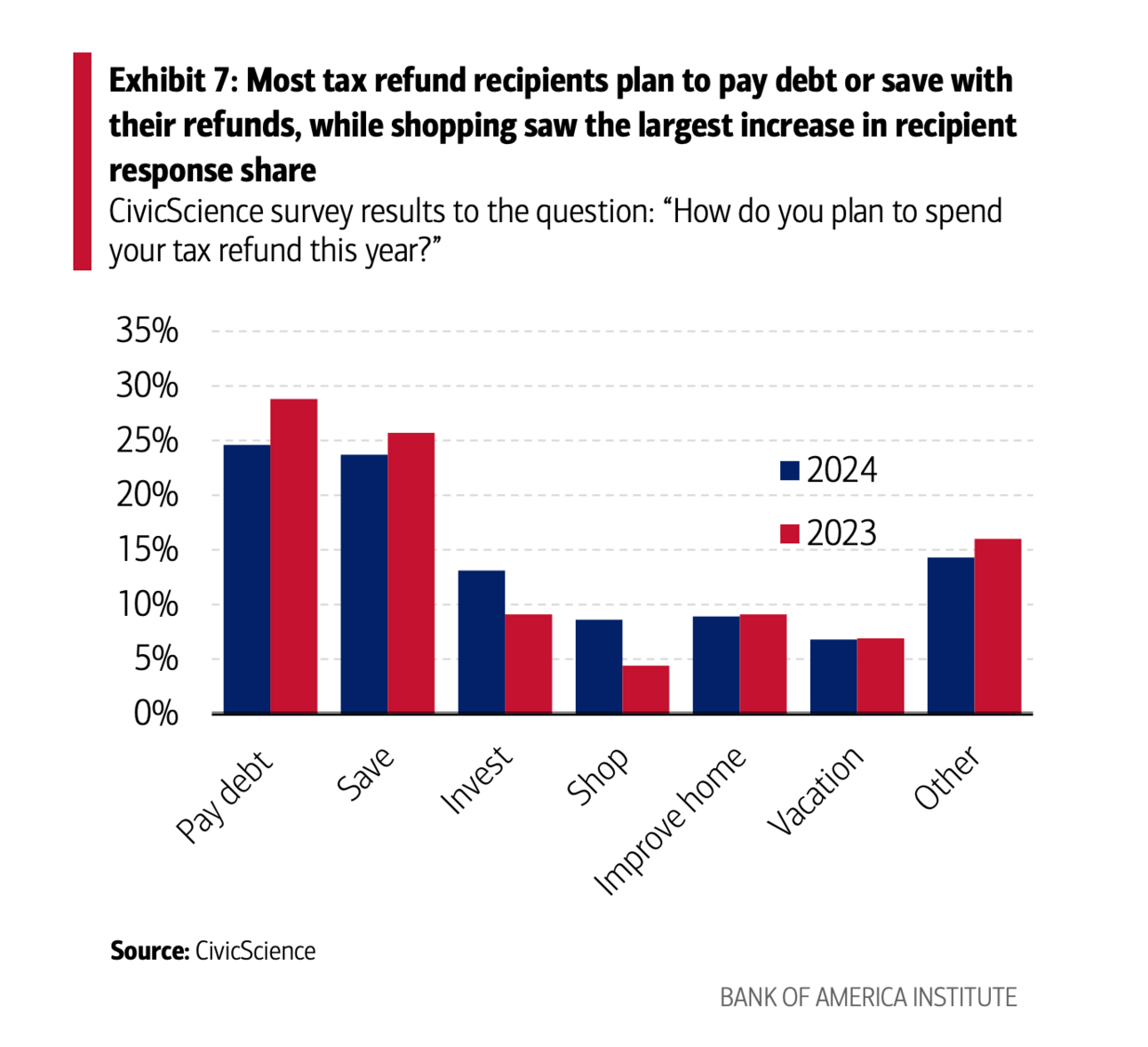 Burning a Hole: According to recent survey data, while the majority of people still plan to pay debts or save their refunds, those intentions have slightly decreased year-over-year. In contrast, the intent to spend on shopping has nearly doubled compared to 2023, indicating a renewed interest in discretionary spending.