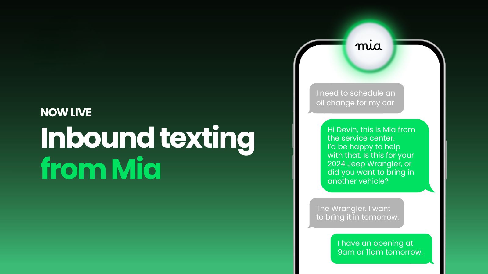 Dropped or unresolved calls shouldn’t mean lost business. With Mia’s new Inbound SMS feature, your dealership can follow up automatically with a friendly text, respond 24/7/365 and connect with customers the way they prefer.