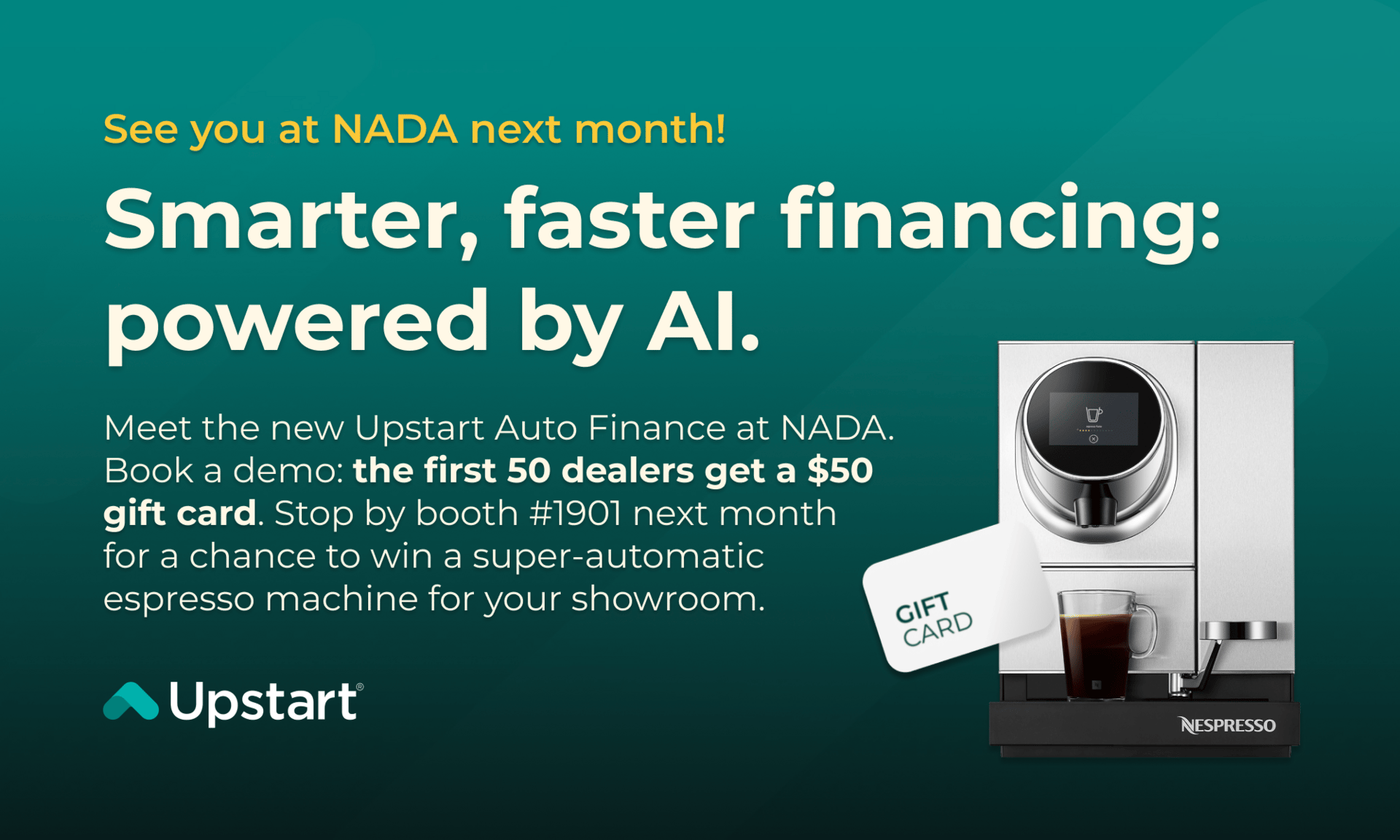 At NADA 2026, see how Upstart Auto Finance uses thousands of data points (not just a credit score) to approve more buyers with faster, more flexible offers. Close more deals with instant, AI-powered decisions, longer terms, and higher LTVs that boost back-end profit without the lender runaround.
