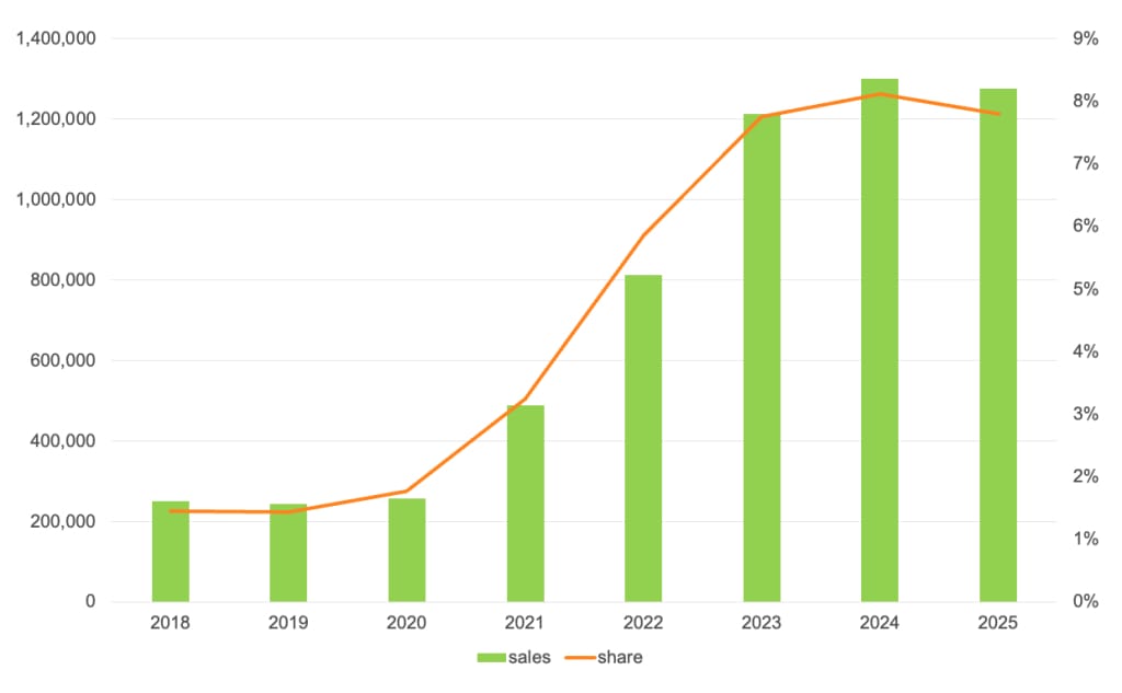 EV share: 7.8% in 2025 (vs 8.1% in 2024)