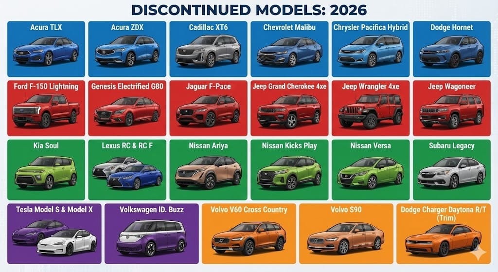 On the luxury side, Acura TLX, Cadillac XT6, Lexus RC, and Volvo’s S90 and V60 wagons are also bowing out, as brands double down on SUVs and electrified models.