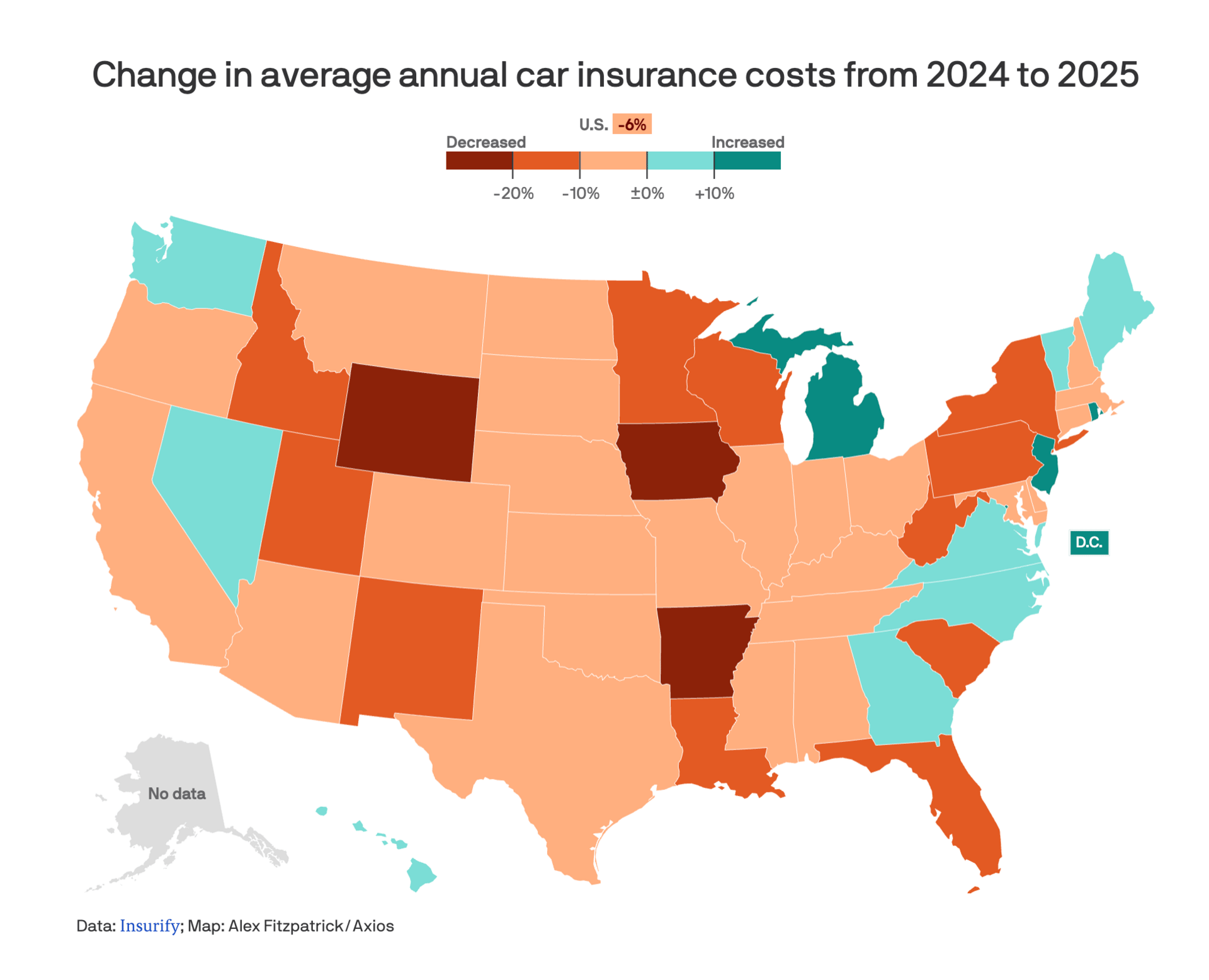 A new Insurify report shows the average annual premium dropped 6% nationwide in 2025 to $2,144 (the first decline since the pandemic).
