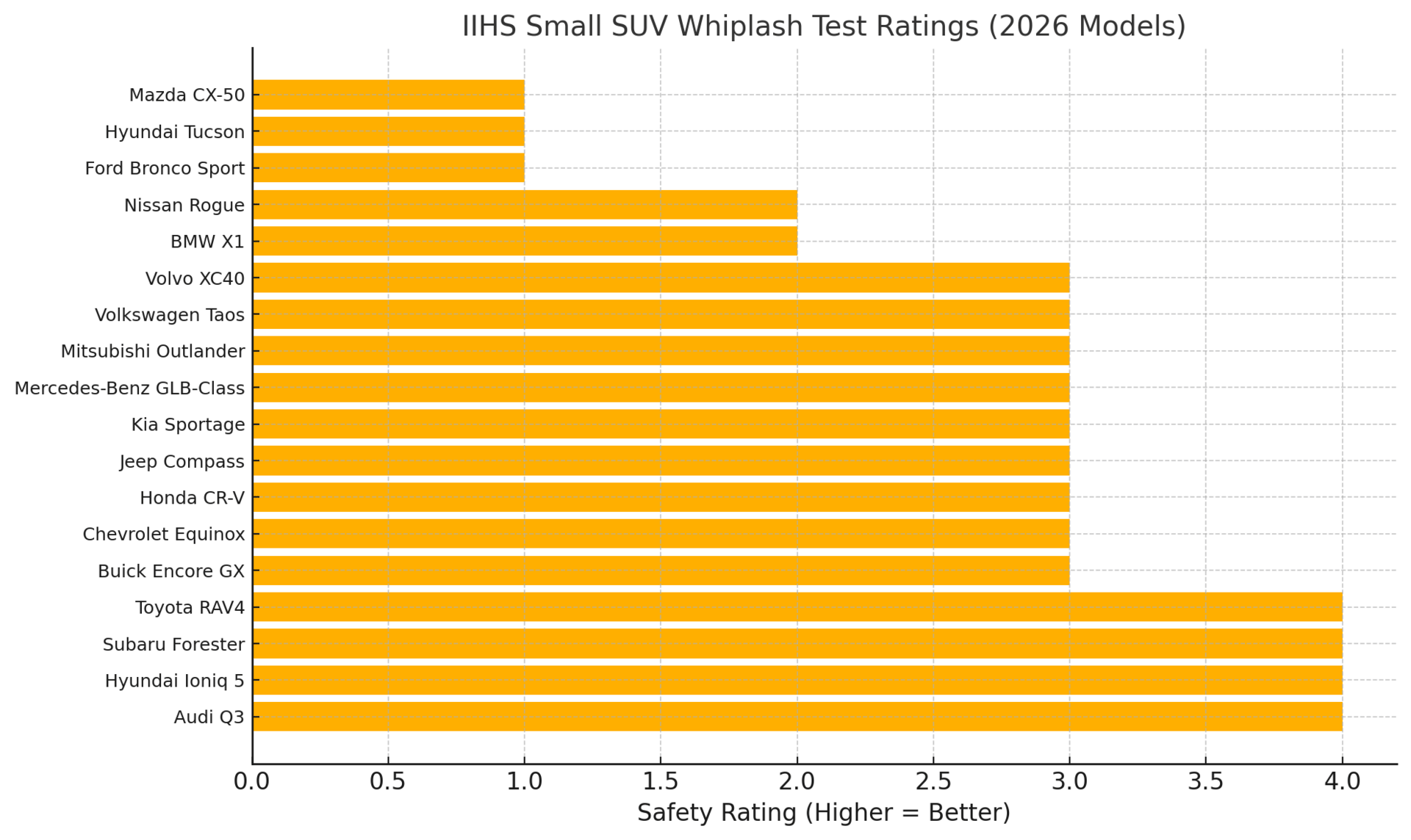 Out of 18 small SUVs tested, only four earned top “Good” ratings: the Audi Q3, Hyundai Ioniq 5, Subaru Forester, and Toyota RAV4. Each showed solid head and spine support and minimal injury potential.