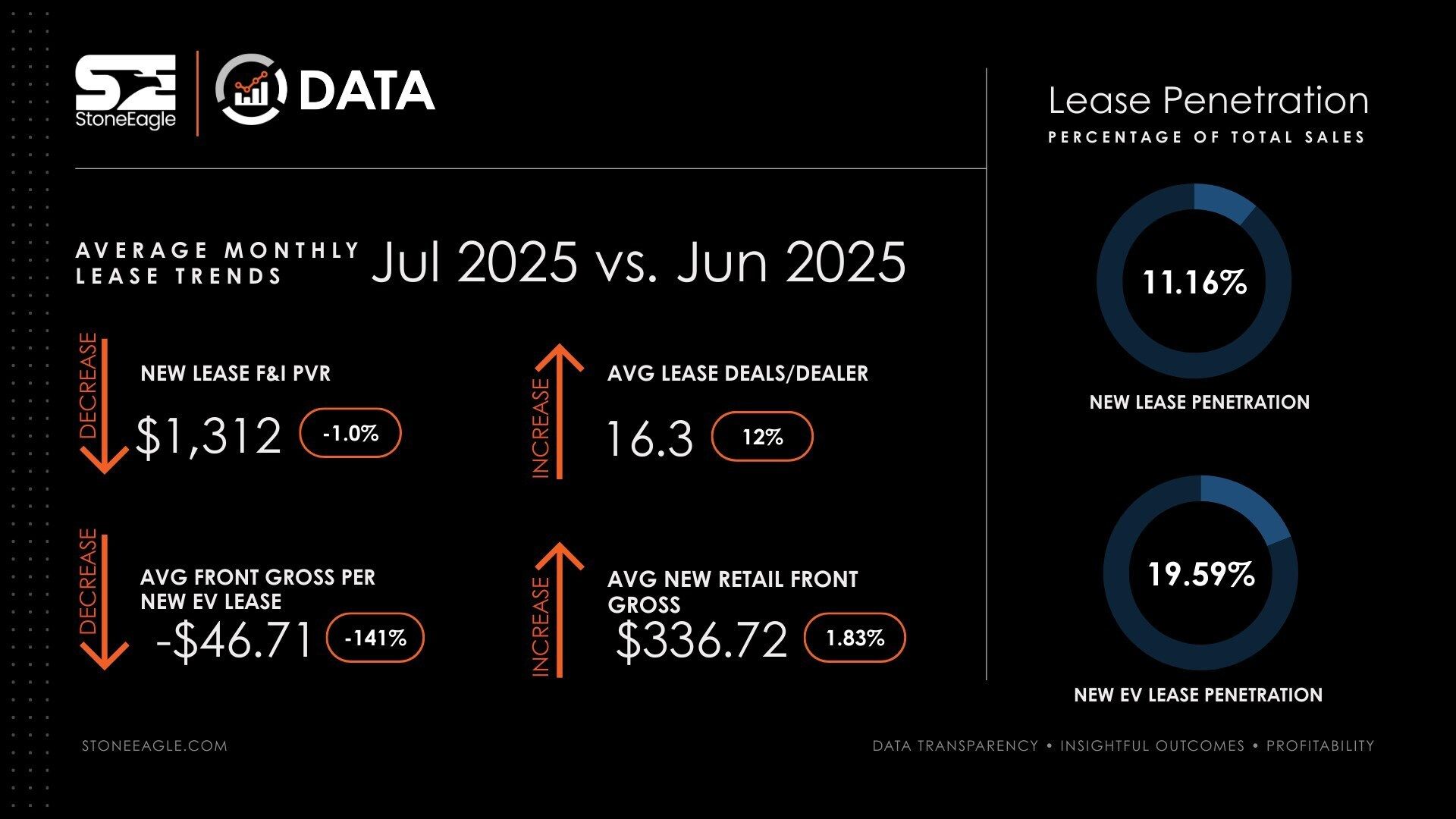 “The spike in EV lease penetration was one of the standout trends in July,” said Colin Snyder, General Manager of StoneEagle’s Automotive Retail Solutions, including StoneEagleDATA, StoneEagleMETRICS, StoneEagleMENU, and StoneEaglePENCILWRENCH.