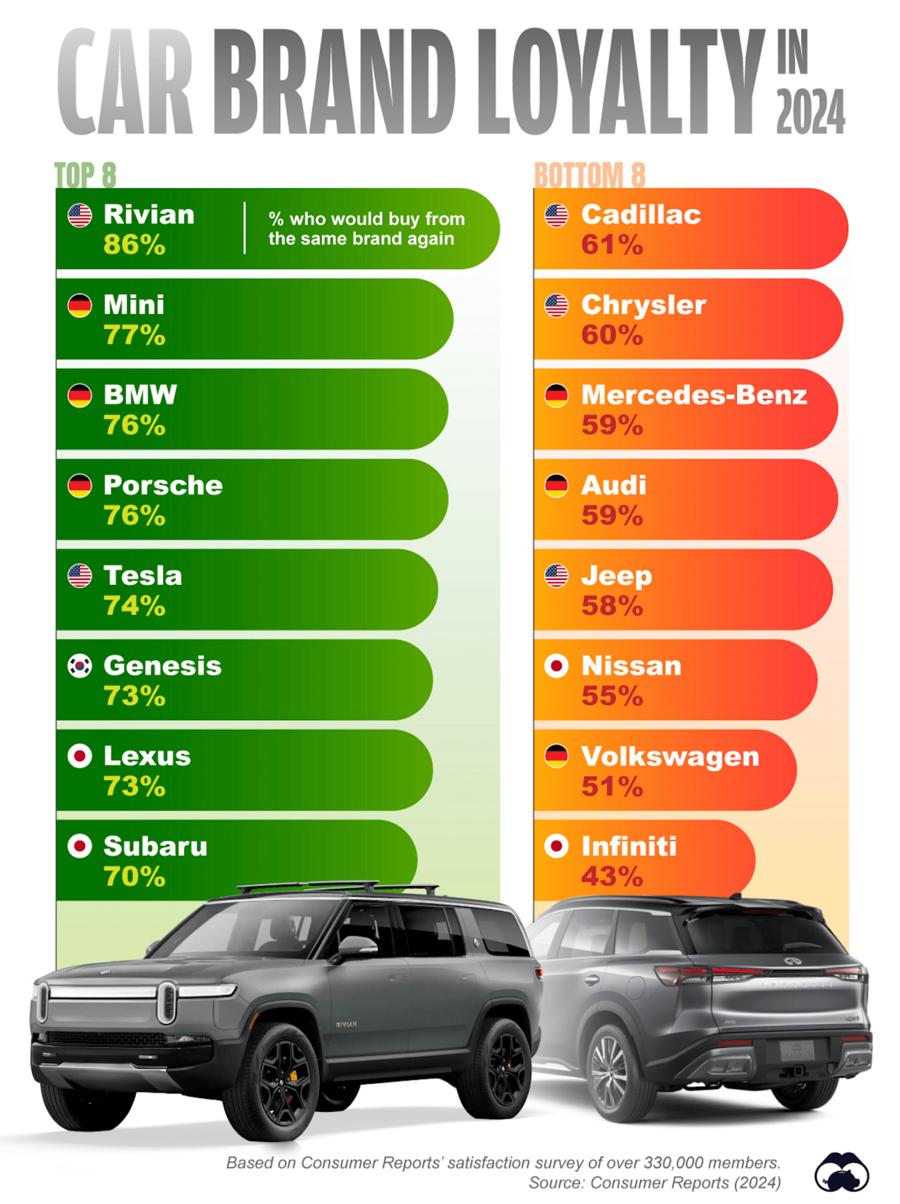 Consumer Reports’ brand loyalty study for 2024 just dropped, and it’s Rivian that’s charging ahead and stealing Tesla’s thunder (they held the #1 spot in last year’s ranking).