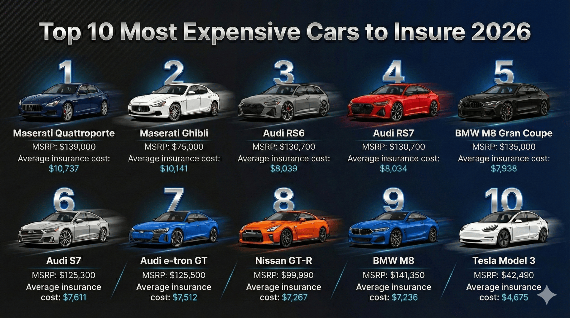 Audi and BMW are also all over the list. The RS6 and RS7 both average over $8K for a policy, and BMW’s M8 Gran Coupe is nearly there at $7,938.