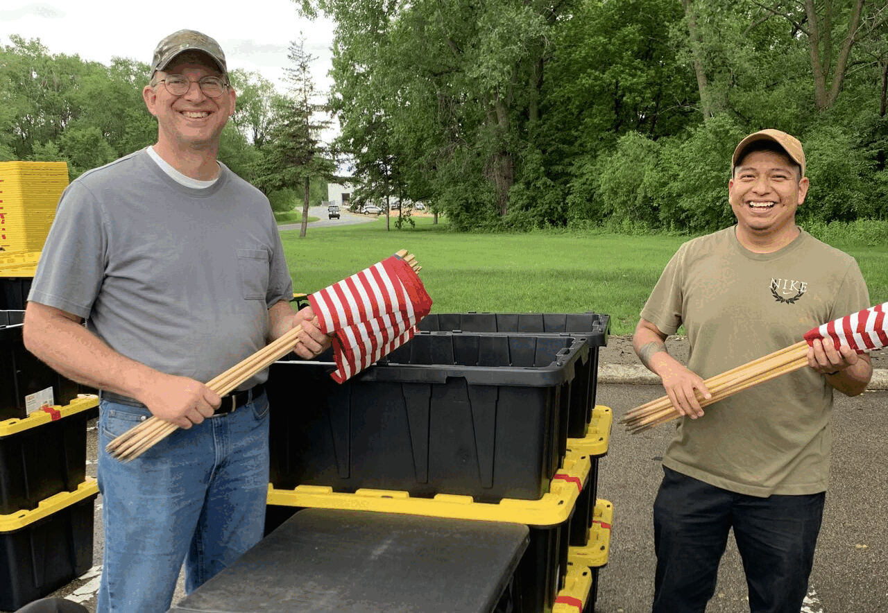 Last Friday, the dedicated “Veterans at Walser” team rolled up their sleeves to prep American flags alongside the nonprofit organization Flags For Fort Snelling. Their mission? To ensure that every grave at Fort Snelling National Cemetery was adorned with red, white, and blue for Memorial Day.